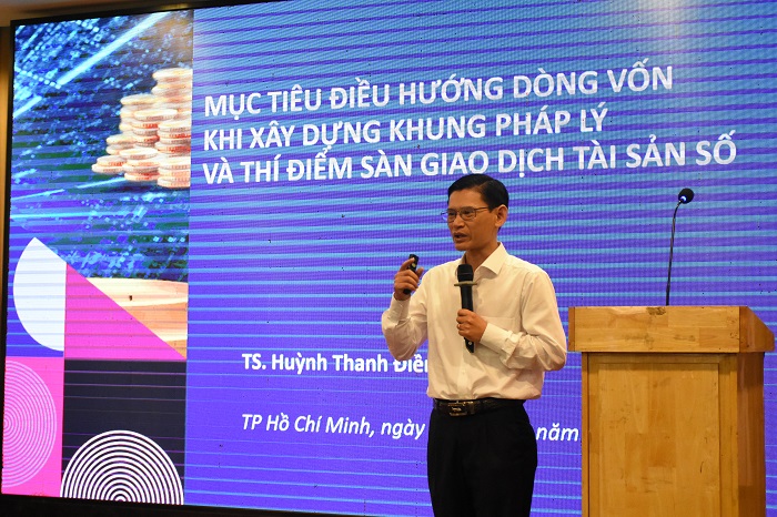 TS. Huỳnh Thanh Điền trình bày tham luận “Mục tiêu điều hướng dòng vốn khi xây dựng khung pháp lý và thí điểm sàn giao dịch tài sản số"