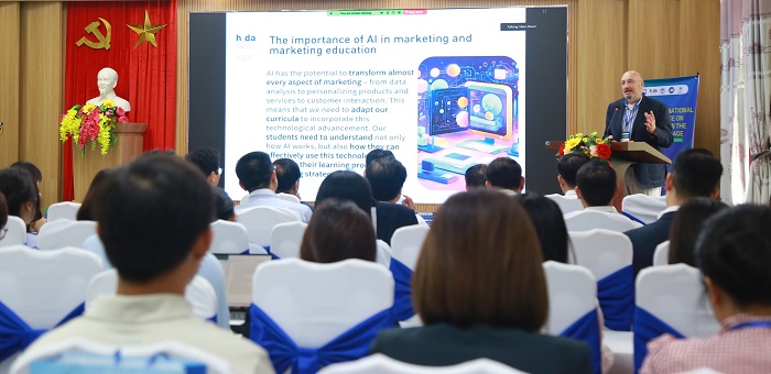 Mở đầu Hội thảo là phần trình bày của GS. Ralf Schellhase với tham luận “Teaching Marketing in A Hyper-Connected World: Opportunities and Challenges of Using AI” (tạm dịch: Giảng dạy Marketing trong thế giới siêu kết nối: Cơ hội và thách thức khi sử dụng AI). Theo đó, diễn giả đã đưa ra những Ứng dụng AI trong giáo dục tiếp thị như: Cá nhân hóa việc học thông qua AI; Đánh giá và phản hồi tự động; Sử dụng chatbot và trợ lý ảo; Tự động tạo tài liệu học tập; Khuyến khích viết sáng tạo.